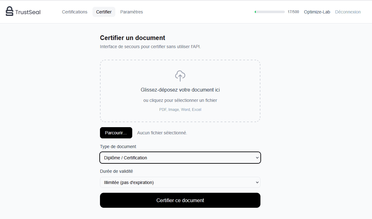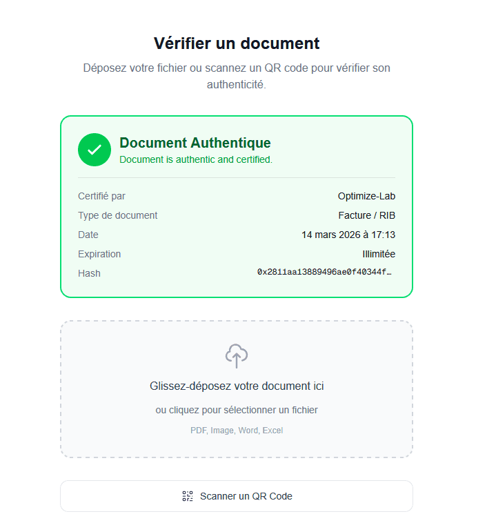 Plateforme et API de certification documentaire sur registre immuable. Utilise l'Account Abstraction (Web3) pour sceller l'empreinte des données de manière infalsifiable et permettre une vérification publique instantanée.